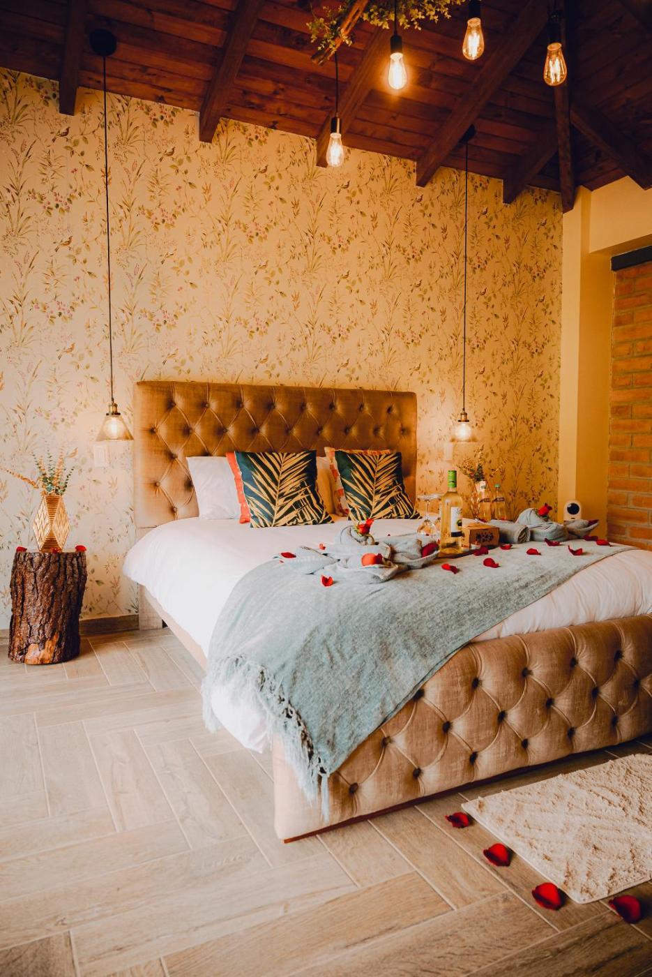 Double Room with Mountain View. The hot tub and fireplace are the standout features of this double room. Offering free toiletries, this double room includes a private bathroom with a bath, a shower and a hairdryer. The unit features a private entrance, garden views, a patio and winechampagne is featured for guests. The unit offers 1 bed. ;
