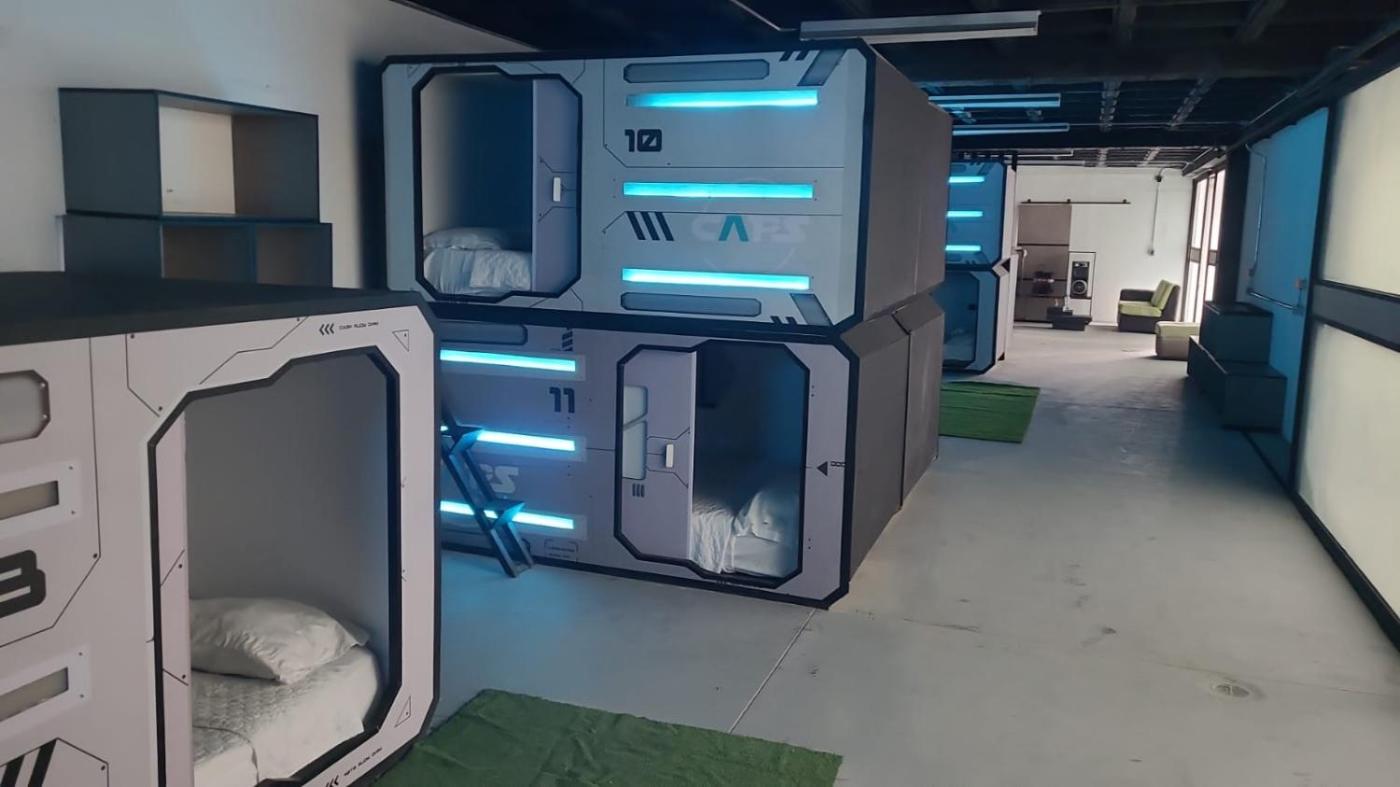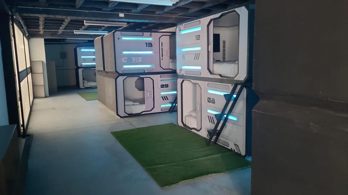 Guest rooms in the capsule hotel are fitted with a flat-screen TV.guest rooms feature a shared bathroom with a shower and free toiletries.
